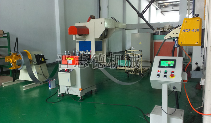 沖壓自動化生產線中,送料機是根據沖壓工藝之需求步進化送料的,因此重型材料架開卷時需配合后續整平機、送料機時開時停的運行,而標準重型材料架開停的控制是通過安裝在機身側面的感應桿(可根據客戶需求換為落地式感應架)來感應控制的。標準重型材料架的自動化控制原理是:感應桿帶有24V直流電壓并與機臺緣,卷料經材料架開卷后料帶向后續機臺輸入時會下垂一定的弧度,當弧度過大接觸到感應架時,24V感應電路接通,經中間繼電器、時間繼電器控制機臺停止運轉,當后續機臺持續使用料帶,使料帶脫離感應架時,材料架就會繼續放料,如此實現了全自動化的控制材料架的開停,只是此種控制方式必須要求所開卷的材料表面能導電才能實現。