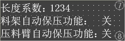 按鍵7:料架自動保壓功能:料架油壓保護功能,可以通過壓力表設(shè)置上限和下限,該功能打開時,料架漲緊會自動啟動(油壓低于下限時),關(guān)閉則不具備此功能。此為內(nèi)部設(shè)置,客戶不得隨意修改,出廠時,此功能為打開狀態(tài)。