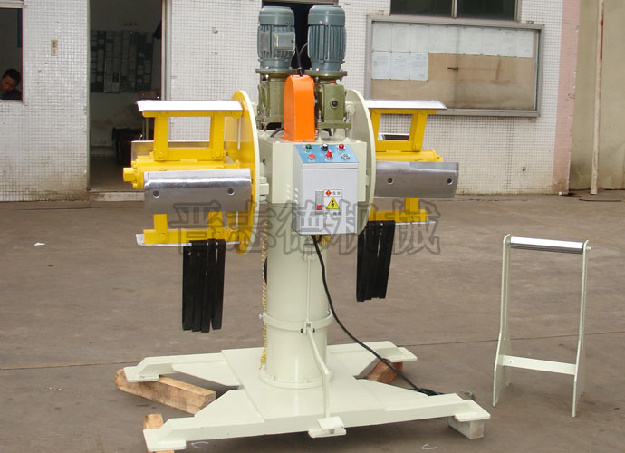 晉志德雙頭材料架由底座、機架、轉(zhuǎn)軸、馬達、電箱組成,其中轉(zhuǎn)軸上均勻安裝有兩個收料主軸,兩個收料主軸以轉(zhuǎn)盤為中心對稱設(shè)置且中軸線相重合;收料主軸上配有呈弧形的支撐塊,支撐塊頂部呈圓弧形以配合料卷的內(nèi)圓料管,支撐桿與支撐塊組合后中間開設(shè)有卡槽,卡槽將支撐塊分割為對稱的兩半組成漲縮筒,雙漲縮筒的結(jié)構(gòu),確保了雙頭材料架實現(xiàn)了無停機快速下料生產(chǎn)之目的。